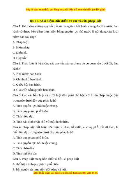 Đây là bản xem th , vu ử i lòng mua tài li u ệ đ xe ể m chi ti t ế (có l i ờ gi i ả ) C. luôn tồn t i ạ trong đ i ờ s ng xã ố h i ộ . D. ph n ả ánh l i ợ ích c a ủ giai c p c ấ m ầ quy n. ề Câu 6. Pháp lu t