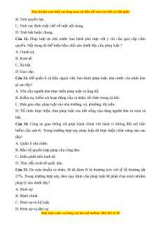 Đây là bản xem th , vu ử i lòng mua tài li u ệ đ xe ể m chi ti t ế (có l i ờ gi i ả ) B. Tính quy n l ề c. ự C. Tính xác đ nh ch ị t ặ ch v ẽ m ề t ặ n i ộ dung. D. Tính b t ắ bu c chung. ộ Câu 12. Pháp lu t ậ do nhà nư c ớ ban hành phù h p ợ v i ớ ý chí c a ủ giai c p ấ c m ầ quy n. N ề i ộ dung đó th hi ể n b ệ n ch ả t ấ nào dư i ớ đây c a pháp l ủ u t ậ ? A. Chính tr . ị B. Kinh t . ế C. Xã h i ộ . D. Giai c p. ấ Câu 13. Để qu n ả lí xã h i ộ , ngoài vi c ệ ban hành pháp lu t ậ , nhà nư c ớ còn ph i ả làm gì sau đây? A. Yêu cầu ngư i ờ dân th c hi ự n pháp l ệ u t ậ và ng h ủ . ộ B. Ki m ể tra, ki m ể sát ho t ạ đ ng ộ c a cá ủ nhân, t ch ổ c ứ trong xã h i ộ . C. Đ a gi ư áo d c ụ pháp lu t ậ vào nhà trư ng, xã, ph ờ ư ng, ờ th t ị r n. ấ D. Tổ ch c ứ th c ự hi n, ệ đ a ư pháp lu t ậ vào đ i ờ s ng ố c a ủ t ng ừ ngư i ờ dân và toàn xã h i ộ .