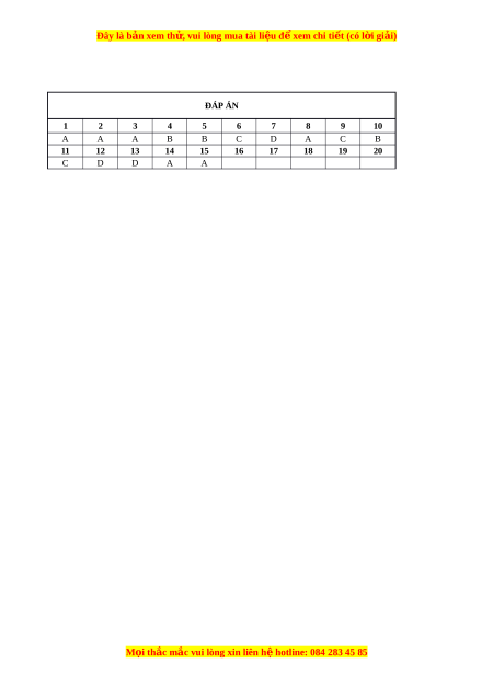 Đây là bản xem th , vu ử i lòng mua tài li u ệ đ xe ể m chi ti t ế (có l i ờ gi i ả ) ĐÁP ÁN 1 2 3 4 5 6 7 8 9 10 A A A B B C D A C B 11 12 13 14 15 16 17 18 19 20 C D D A A M i ọ thắc m c