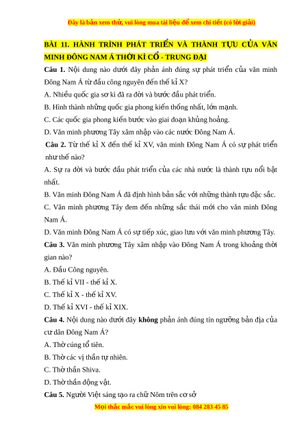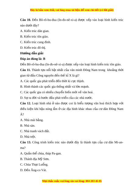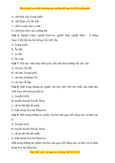 Đây là bản xem th , vu ử i lòng mua tài li u ệ đ xe ể m chi ti t (c ế ó l i ờ gi i ả ) A. chữ Hán c a ủ Trung Quốc. B. ch Ph ữ n c ạ a ủ n Đ Ấ . ộ C. ch L ữ a-tinh c a ủ La Mã. D. chữ hình nêm c a L ủ ư ng H ỡ à. Câu 6. Ngư i ờ Chăm, ngư i ờ Kh - ơ me, ngư i ờ Thái, ngư i ờ Môn,… ở Đông Nam Á đã ti p t ế hu h t ệ h ng ch ố vi ữ t ế c a ủ A. Trung Quốc. B. n Đ Ấ . ộ C. La Mã. D. Hy L p. ạ Câu 7. Văn h c ọ Vi t ệ Nam th i ờ quân chủ ch u ị nh ả hư ng s ở âu s c c ắ a ủ A. văn h c ọ n Đ Ấ . ộ B. văn h c ọ Trung Qu c. ố C. văn h c ph ọ ư ng ơ Tây. D. văn h c ọ - Ả r p. ậ Câu 8. M t ộ trong nh ng ữ tác ph m ẩ văn h c ọ chữ vi t ế tiêu bi u ể c a ủ nhân dân Việt Nam th i ờ phong ki n l ế à A. Truy n K ệ i u. ề B. truy n t ề huy t ế P - ơ r c ắ Thon. C. s t ử hi Đ đ ẻ t ấ đ n ẻ ư c. ớ D. th n t ầ ho i ạ Pun-h N ơ han-h . ơ Câu 9. M t ộ trong nh ng ữ tác ph m ẩ văn h c ọ dân gian n i ổ ti ng ế c a ủ c ư dân Lào là A. Truy n K ệ i u. ề B. truy n t ề huy t ế P - ơ r c ắ Thon. C. s t ử hi Đ đ ẻ t ấ đ n ẻ ư c. ớ D. th n t ầ ho i ạ Pun-h N ơ han-h . ơ M t ộ trong nh ng ữ tác ph m ẩ văn h c dân gi ọ an n i ổ ti ng c ế a c ủ ư dân Lào là th n ầ tho i ạ Pun-h N ơ han-h . ơ M i ọ thắc m c