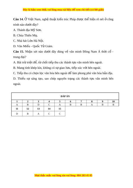 ể àm phong phú văn hóa b n đ ả a. ị D. Thi u ế sự sáng t o, ạ sao chép nguyên tr ng ạ các thành t u ự văn minh bên ngoài. ĐÁP ÁN 1 2 3 4 5 6 7 8 9 10 A B D C A B B A B B 11 12 13 14 15 D B A C C M i ọ thắc m c