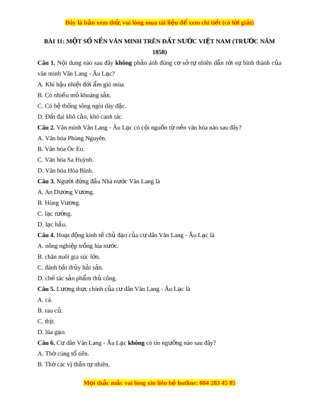 Câu 2. Văn minh Văn Lang - Âu L c ạ có c i ộ ngu n ồ t n ừ n vă ề n hóa nào sau đây? A. Văn hóa Phùng Nguyên. B. Văn hóa Óc Eo. C. Văn hóa Sa Huỳnh. D. Văn hóa Hòa Bình. Câu 3. Người đ ng ứ đầu Nhà nư c ớ Văn Lang là A. An Dư ng ơ Vư ng. ơ B. Hùng Vư ng. ơ C. lạc tư ng. ớ D. lạc hầu. Câu 4. Hoạt đ ng ộ kinh tế chủ đạo c a ủ c dâ ư n Văn Lang - Âu L c ạ là A. nông nghi p t ệ r ng l ồ úa nư c ớ . B. chăn nuôi gia súc l n. ớ C. đánh bắt th y h ủ ải sản.