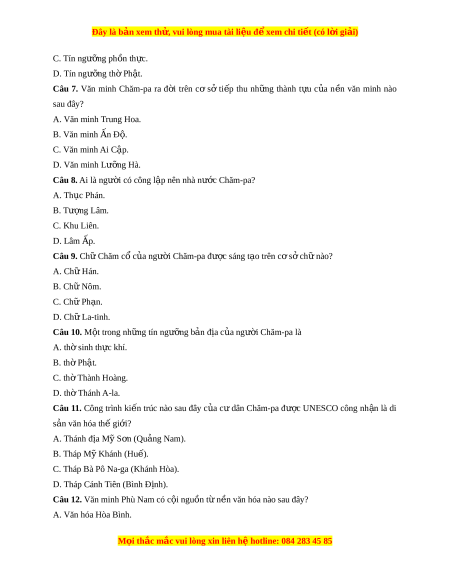 ờ có công lập nên nhà nư c ớ Chăm-pa? A. Th c ụ Phán. B. Tư ng ợ Lâm. C. Khu Liên. D. Lâm p. Ấ Câu 9. Ch Chă ữ m c c ổ ủa ngư i ờ Chăm-pa đư c ợ sáng t o t ạ rên c s ơ c ở h nà ữ o? A. Ch H ữ án. B. Chữ Nôm. C. Chữ Phạn. D. Ch L ữ a-tinh. Câu 10. M t ộ trong nh ng ữ tín ngư ng ỡ bản địa c a ủ ngư i ờ Chăm-pa là A. thờ sinh th c ự khí. B. thờ Phật. C. thờ Thành Hoàng. D. thờ Thánh A-la.