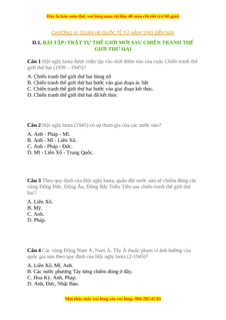 D.1. BÀI TẬP: TRẬT TỰ THẾ GIỚI MỚI SAU CHIẾN TRANH THẾ GIỚI THỨ HAI