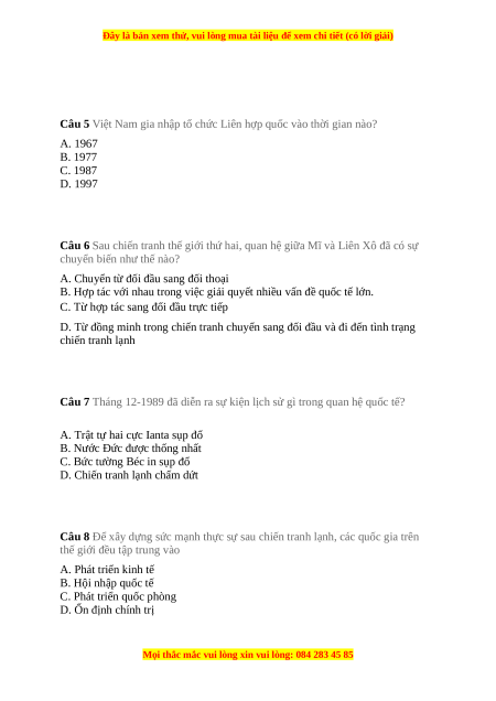 Câu 5 Việt Nam gia nhập tổ chức Liên hợp quốc vào thời gian nào? A. 1967 B. 1977 C. 1987 D. 1997