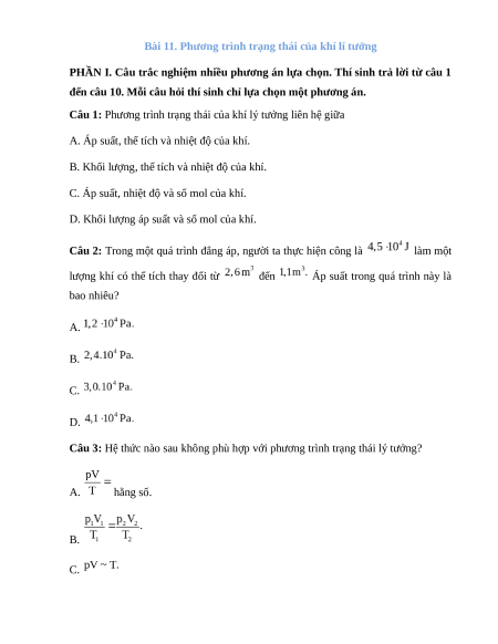 Câu 1: Phương trình trạng thái của khí lý tưởng liên hệ giữa