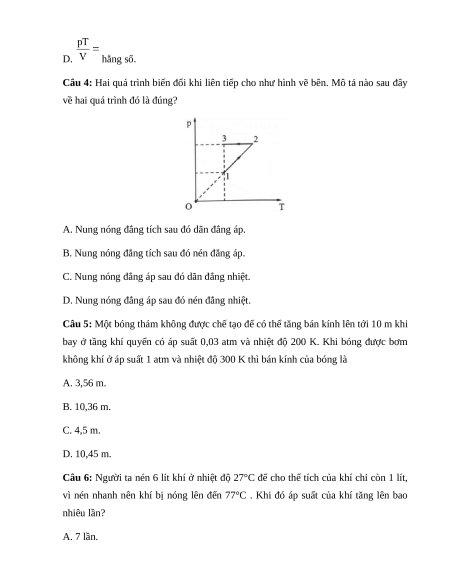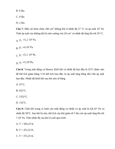vì nén nhanh nên khí bị nóng lên đến 77°C . Khi đó áp suất của khí tăng lên bao nhiêu lần? A. 7 lần. B. 6 lần. C. 4 lần. D. 2 lần.