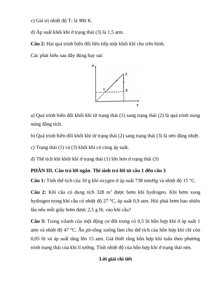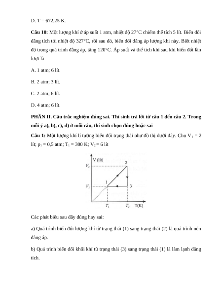 Câu 10: Một lượng khí ở áp suất 1 atm, nhiệt độ 27°C chiếm thể tích 5 lít. Biến đổi