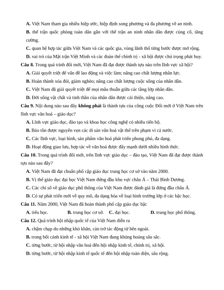 Câu 10. Trong quá trình đổi mới, trên lĩnh vực giáo dục – đào tạo, Việt Nam đã đạt được thành tựu nào sau đây?