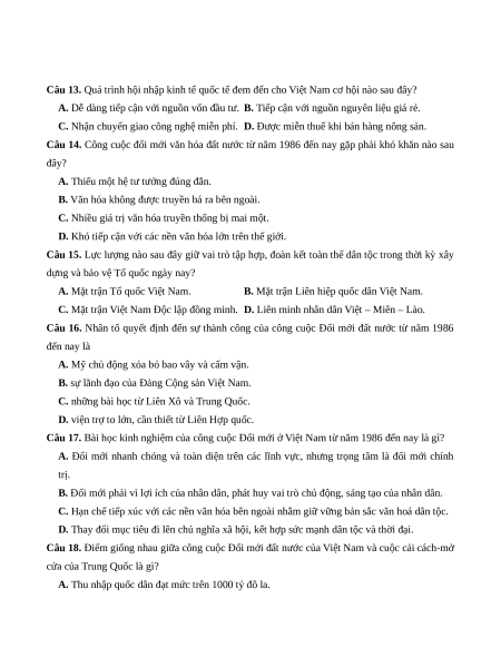 Câu 18. Điểm giống nhau giữa công cuộc Đổi mới đất nước của Việt Nam và cuộc cải cách-mở