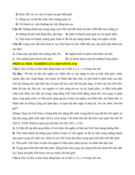 Câu 19. Những thành tựu trong công cuộc Đổi mới đất nước từ năm 1986 đến nay chứng tỏ