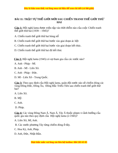 BÀI 11: TRẬT TỰ THẾ GI I Ớ M I Ớ SAU CHI N Ế TRANH THẾ GI I Ớ THỨ HAI Câu 1: H i ộ ngh I ị anta đư c ợ tri u t ệ p vào ậ th i ờ đi m ể nào c a cu ủ c ộ Chi n t ế ranh th gi ế i ớ th hai ứ (1939 – 1945)? A. Chi n t ế ranh th gi ế i ớ th hai ứ bùng n ổ B. Chi n t ế ranh th gi ế i ớ th hai ứ bư c ớ vào giai đo n ác ạ li t ệ C. Chi n t ế ranh th gi ế i ớ th hai ứ bư c ớ vào giai đo n k ạ t ế thúc. D. Chi n t ế ranh th gi ế i ớ th hai ứ đã k t ế thúc Câu 2: H i ộ ngh I ị anta (1945) có s t ự ham gia c a ủ các nư c ớ nào? A. Anh - Pháp - Mĩ. B. Anh - Mĩ - Liên Xô. C. Anh - Pháp - Đ c. ứ