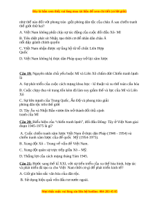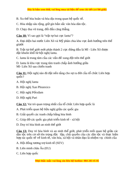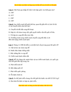 Đây là bản xem th , vu ử i lòng mua tài li u ệ đ xe ể m chi ti t (c ế ó l i ờ gi i ả ) B. Xu th hòa hoãn và hòa ế d u t ị rong quan h qu ệ c ố t . ế C. Hòa nh p s ậ âu r ng, gi ộ gì ữ n b n s ả c ắ văn hóa dân t c. ộ D. Ch y ạ đua vũ trang, đ i ố đ u căng t ầ h ng. ẳ Câu 10: Vì sao g i ọ là “tr t ậ t hai ự c c ự Ianta”? A. Đ i ạ di n hai ệ nư c ớ Liên Xô và M phân chi ỹ a khu v c ự nh h ả ư ng ở trên th ế giư i ớ B. Tr t ậ t t ự h gi ế i ớ m i ớ phân thành 2 c c ự đ ng đ ứ u l ầ à Mĩ - Liên Xô đư c ợ đ t ặ khuôn khổ t h ừ i ộ ngh I ị anta. C. Ianta là trung tâm c a ủ các v n đ ấ xung đ ề t ộ trên th gi ế i ớ D. Ianta là khu v c ự trung tâm tranh ch p ấ nh h ả ư ng ở gi a ữ Mĩ- Liên Xô sau chi n t ế ranh Câu 11: H i ộ ngh nào đã đ ị t ặ n n t ề ng cho s ả ự ra đ i ờ c a t ủ ch ổ c L ứ iên h p ợ quốc? A. H i ộ ngh I ị anta B. H i ộ ngh X ị an Phranxico C. H i ộ ngh P ị t ố xđam D. H i ộ ngh Par ị i