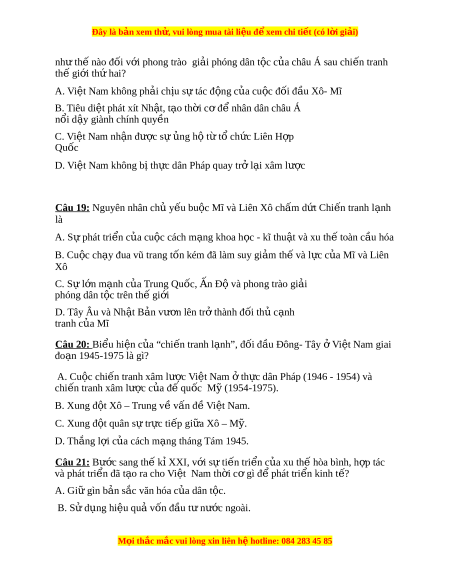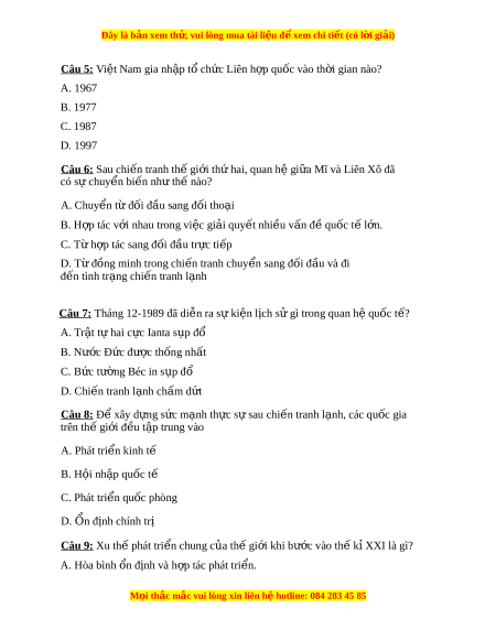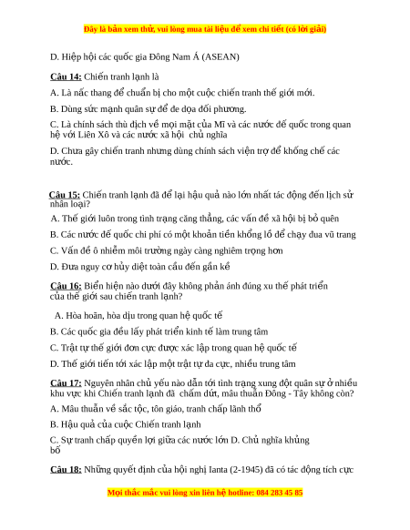 Đây là bản xem th , vu ử i lòng mua tài li u ệ đ xe ể m chi ti t (c ế ó l i ờ gi i ả ) D. Hi p h ệ i ộ các qu c gi ố a Đông Nam Á (ASEAN) Câu 14: Chi n ế tranh l nh ạ là A. Là n c t ấ hang đ chu ể n b ẩ cho ị m t ộ cu c chi ộ n t ế ranh th gi ế i ớ m i ớ . B. Dùng s c ứ m nh quân s ạ ự đ đe d ể a ọ đ i ố phư ng. ơ C. Là chính sách thù đ ch ị v m ề i ọ m t ặ c a ủ Mĩ và các nư c đ ớ qu ế c t ố rong quan hệ v i
