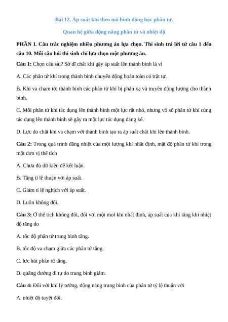 Câu 4: Đối với khí lý tưởng, động năng trung bình của phân tử tỷ lệ thuận với