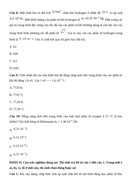 Câu 9: Tính nhiệt độ của một khối khí để động năng tịnh tiến trung bình của các phân tử