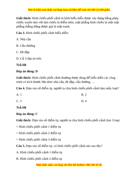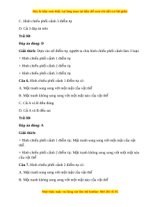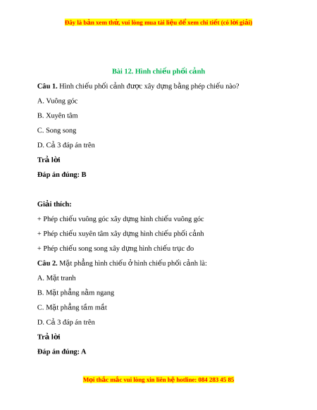 Đây là bản xem th , vu ử i lòng mua tài li u ệ đ xe ể m chi ti t (c ế ó l i ờ gi i ả ) Bài 12. Hình chi u ph ế i ố c nh ả Câu 1. Hình chi u ế phối c nh ả đư c xây ợ d ng b ự ng phép chi ằ u ế nào? A. Vuông góc B. Xuyên tâm C. Song song D. C 3 đáp án ả trên Trả l i ờ Đáp án đúng: B Giải thích: + Phép chi u vuông góc ế xây d ng hì ự nh chi u vuông góc ế + Phép chi u xuyên ế tâm xây d ng hì ự nh chi u ph ế i ố c nh ả + Phép chi u s ế ong song xây d ng hì ự nh chi u t ế r c ụ đo Câu 2. M t ặ ph ng ẳ hình chi u ế hì ở nh chi u ph ế ối c nh ả là: A. M t ặ tranh B. M t ặ ph ng n ẳ m ằ ngang C. M t ặ ph ng t ẳ m ầ m t ắ D. C 3 đáp án ả trên Trả l i ờ Đáp án đúng: A M i