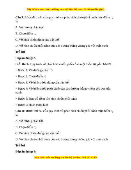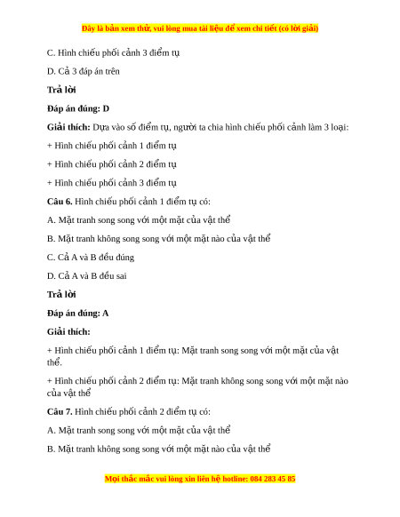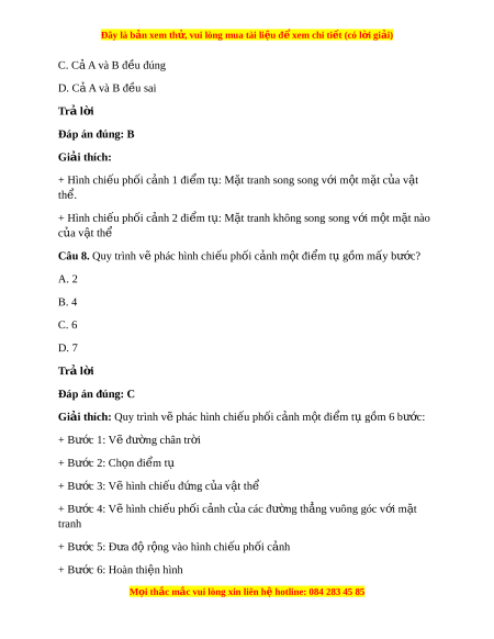 Đây là bản xem th , vu ử i lòng mua tài li u ệ đ xe ể m chi ti t (c ế ó l i ờ gi i ả ) C. Cả A và B đ u đúng ề D. C ả A và B đ u s ề ai Trả l i ờ Đáp án đúng: B Giải thích: + Hình chi u ph ế ối c nh ả 1 đi m ể t : ụ M t ặ tranh song song v i ớ m t ộ m t ặ c a v ủ t ậ th . ể + Hình chi u ph ế ối c nh ả 2 đi m ể t : ụ M t ặ tranh không song song v i ớ m t ộ m t ặ nào c a ủ v t ậ thể