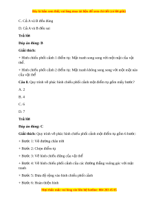 Giải thích: D a vào s ự ố đi m ể t , ng ụ ư i ờ ta chia hình chi u ph ế i ố c nh ả làm 3 lo i ạ : + Hình chi u ph ế ối c nh ả 1 đi m ể tụ + Hình chi u ph ế ối c nh ả 2 đi m ể tụ + Hình chi u ph ế ối c nh ả 3 đi m ể tụ Câu 6. Hình chi u ế phối c nh ả 1 đi m ể t có: ụ A. M t ặ tranh song song v i ớ m t ộ m t ặ c a v ủ t ậ thể B. M t ặ tranh không song song v i ớ m t ộ m t ặ nào c a ủ v t ậ thể C. Cả A và B đ u đúng ề D. C ả A và B đ u s ề ai Trả l i ờ Đáp án đúng: A Giải thích: + Hình chi u ph ế ối c nh ả 1 đi m ể t : ụ M t ặ tranh song song v i ớ m t ộ m t ặ c a v ủ t ậ th . ể + Hình chi u ph ế ối c nh ả 2 đi m ể t : ụ M t ặ tranh không song song v i ớ m t ộ m t ặ nào c a ủ v t ậ thể Câu 7. Hình chi u ế phối c nh ả 2 đi m ể t có: ụ A. M t ặ tranh song song v i ớ m t ộ m t ặ c a v ủ t ậ thể B. M t ặ tranh không song song v i ớ m t ộ m t ặ nào c a ủ v t ậ thể M i
