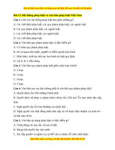 Câu 7. Về hình th c, ứ h t ệ hống pháp lu t ậ đư c t ợ h hi ể n qua ệ A. các ch đ ế nh pháp l ị u t ậ . B. các văn b n ả quy ph m ạ pháp lu t ậ . C. các ngành lu t ậ D. đáp án khác. Câu 8. T p ậ h p ợ các quy ph m ạ pháp lu t ậ có cùng tính ch t ấ đi u ề chỉnh nhóm quan hệ xã h i ộ tư ng ơ ng đ ứ ư c ợ g i ọ là gì? A. Chế định pháp lu t ậ . B. Ngành lu t ậ . C. Quy ph m ạ pháp lu t ậ . D. Văn b n ả pháp lu t ậ . Câu 9. Ai là ngư i ờ ban hành văn b n ả quy ph m ạ pháp lu t ậ ? A. Chủ tịch nư c ớ B. ngư i ờ có th m ẩ quy n t ề heo pháp lu t ậ quy đ nh. ị C. các cơ quan nhà nư c ớ D. các c quan nhà ơ nư c, ng ớ ư i ờ có th m ẩ quy n t ề heo pháp lu t ậ quy đ nh. ị