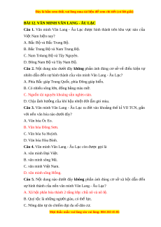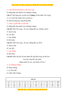 A. Có vũ khí tốt, thành C L ổ oa kiên c . ố B. Kinh đô đóng t i ạ vùng Phong Khê. C. Ch a có ư quân đ i ộ và ch vi ữ t ế . D. Đ ng ứ đ u nhà ầ nư c l ớ à An Dư ng ơ Vư ng. ơ Câu 18. Th i ờ Văn Lang - Âu L c, đ ạ ng đ ứ u các ầ chi ng, ch ề l ạ à A. Quan Lang. B. L c h ạ u. ầ C. L c t ạ ư ng. ớ D. Bồ chính. Câu 19. Th i ờ Văn Lang - Âu L c, đ ạ ng đ ứ u các ầ b l ộ à A. Quan Lang. B. L c h ạ u. ầ C. L c t ạ ư ng. ớ D. Bồ chính. Câu 20. Nhân v t ậ l ch s ị nào ử đư c đ ợ c ề p đ ậ n t ế rong câu đ s ố au? Vua nào công đ c l ứ u danh, ư D ng ự nư c  ớ u L c, xây t ạ hành Cổ Loa? A. An Dư ng ơ Vư ng. ơ B. Hùng vư ng. ơ C. Lý Nam Đ . ế D. Tri u ệ Vi t ệ Vư ng. ơ ĐÁP ÁN 1 2 3 4 5 6 7 8 9 10 A C B D A C D B A D 11 12 13 14 15 16 17 18 19 20 A A C B B C C D C A M i ọ thắc m c