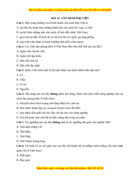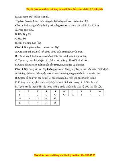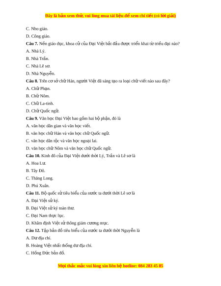 Đây là bản xem th , vu ử i lòng mua tài li u ệ đ xe ể m chi ti t (c ế ó l i ờ gi i ả ) C. Nho giáo. D. Công giáo. Câu 7. Nền giáo d c ụ , khoa c c ử a ủ Đại Vi t ệ bắt đầu đư c ợ tri n kha ể i t t ừ ri u ề đ i ạ nào? A. Nhà Lý. B. Nhà Trần. C. Nhà Lê s . ơ D. Nhà Nguy n. ễ Câu 8. Trên c s ơ c ở hữ Hán, ngư i ờ Vi t ệ đã sáng t o ra ạ lo i ạ chữ vi t ế nào sau đây? A. Ch P ữ hạn. B. Chữ Nôm. C. Chữ La-tinh. D. Ch Q ữ u c ố ng . ữ Câu 9. Văn h c ọ Đại Vi t ệ bao g m ồ hai b ph ộ n, đó l ậ à A. văn h c ọ dân gian và văn h c ọ vi t ế . B. văn h c ọ chữ Hán và văn h c ọ chữ Qu c ố ng . ữ C. văn h c ọ dân tộc và văn h c ọ ngoại lai. D. văn h c ọ ch N ữ ôm và văn h c ọ chữ Quốc ng . ữ Câu 10. Kinh đô c a ủ Đại Việt dư i ớ th i ờ Lý, Tr n và ầ Lê s l ơ à A. Hoa L . ư B. Tây Đô. C. Thăng Long. D. Phú Xuân. Câu 11. Bộ qu c ố s t ử iêu bi u c ể a ủ nư c ớ ta dưới thời Lê s l ơ à A. Đại Vi t ệ s ký. ử B. Đại Vi t ệ s ký t ử oàn th . ư C. Đại Nam th c ự l c ụ . D. Khâm đ nh ị Vi t ệ s t ử hông giám cư ng m ơ c ụ .