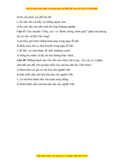 Đây là bản xem th , vu ử i lòng mua tài li u ệ đ xe ể m chi ti t ế (có l i ờ gi i ả ) A. Săn b t ắ thú r ng. ừ B. Trồng lúa nư c ớ C. Đúc đồng. D. Làm đồ gốm Câu 12: Xã h i ộ Văn Lang không mang đ c ặ đi m ể nào sau đây?