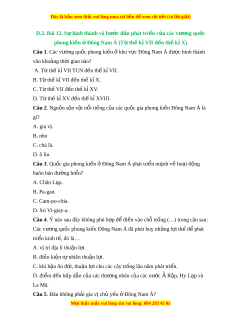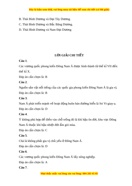 Đây là bản xem th , vu ử i lòng mua tài li u ệ đ xe ể m chi ti t ế (có l i ờ gi i ả ) B. Thái Bình Dư ng và Đ ơ i ạ Tây Dư ng. ơ C. Thái Bình Dư ng và B ơ c B ắ ăng Dư ng. ơ D. Thái Bình Dư ng ơ và Nam Đ i ạ Dư ng ơ L I Ờ GIẢI CHI TI T Ế Câu 1. Các vư ng qu ơ ốc phong ki n Đ ế ông Nam Á đư c ợ hình thành t t ừ h k ế ỉVII đ n ế th k ế ỉ X. Đáp án cần ch n ọ là: B Câu 2. Nguồn s n ả v t ậ nổi ti ng ế c a các ủ qu c gi ố a phong ki n