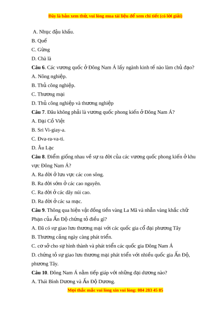 Đây là bản xem th , vu ử i lòng mua tài li u ệ đ xe ể m chi ti t ế (có l i ờ gi i ả ) A. Nh c đ ụ u ậ kh u. ấ B. Quế C. G ng ừ D. Chà là Câu 6. Các vư ng qu ơ ốc Đ ở ông Nam Á l y ngành ki ấ nh t nào l ế àm chủ đ o? ạ A. Nông nghi p. ệ B. Th công ủ nghiệp. C. Thư ng ơ m i ạ D. Th công nghi ủ ệp và thư ng nghi ơ p ệ