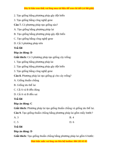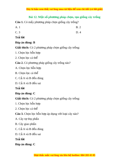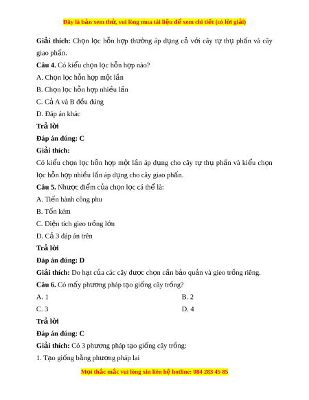 Đây là bản xem th , vu ử i lòng mua tài li u ệ đ xe ể m chi ti t (c ế ó l i ờ gi i ả ) Giải thích: Ch n ọ l c ọ h n ỗ h p ợ thư ng ờ áp d ng ụ cả v i ớ cây tự thụ ph n ấ và cây giao phấn. Câu 4. Có ki u ch ể n l ọ c ọ h n h ỗ p nào? ợ A. Ch n l ọ c h ọ ỗn h p m ợ t ộ lần B. Ch n l ọ c ọ h n h ỗ p ợ nhi u l ề n ầ C. Cả A và B đ u đúng ề D. Đáp án khác Trả l i ờ Đáp án đúng: C Giải thích: Có ki u ể ch n ọ l c ọ h n ỗ h p ợ m t ộ l n ầ áp d ng ụ cho cây tự thụ ph n ấ và ki u ể ch n ọ l c ọ hỗn h p ợ nhi u ề l n áp d ầ ng ụ cho cây giao ph n. ấ Câu 5. Như c ợ đi m ể c a ch ủ n ọ l c cá ọ thể là: A. Ti n ế hành công phu B. T n kém ố C. Di n t ệ ích gieo tr ng l ồ n ớ D. C 3 đáp án ả trên Trả l i ờ Đáp án đúng: D Giải thích: Do h t ạ c a ủ các cây đư c ch ợ n ọ c n b ầ o qu ả n ả và gieo tr ng r ồ iêng.