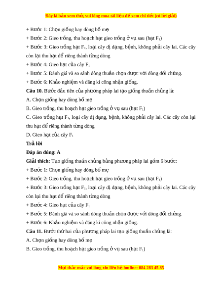 Đây là bản xem th , vu ử i lòng mua tài li u ệ đ xe ể m chi ti t (c ế ó l i ờ gi i ả ) + Bư c 1: ớ Ch n ọ gi ng hay ố dòng b m ố ẹ + Bư c 2: ớ Gieo trồng, thu hoạch h t ạ gieo tr ng ồ v ở s ụ au (h t ạ F1) + Bư c ớ 3: Gieo tr ng ồ h t ạ F1, lo i ạ cây dị d ng, ạ b nh, ệ không ph i ả cây lai. Các cây còn l i ạ thu h t ạ đ r ể iêng thành t ng dòng ừ + Bư c 4: ớ Gieo h t ạ c a cây ủ F1 + Bư c 5: ớ