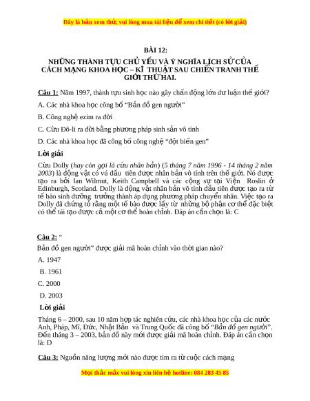 Đây là bản xem th , vu ử i lòng mua tài li u ệ đ xe ể m chi ti t (c ế ó l i ờ gi i ả ) BÀI 12: NH N Ữ G THÀNH T U Ự CH Ủ Y U Ế VÀ Ý NGHĨA L C Ị H S C Ử A Ủ CÁCH MẠNG KHOA H C Ọ – KĨ THU T Ậ SAU CHI N Ế TRANH THẾ GI I Ớ THỨ HAI.