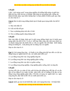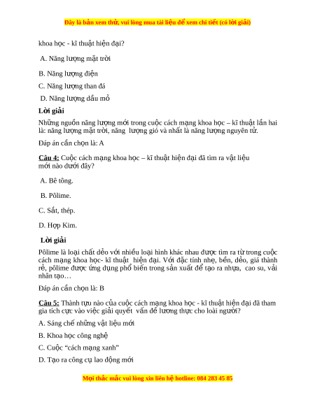 Câu 4: Cuộc cách m ng khoa h ạ c ọ – kĩ thu t ậ hi n đ ệ i ạ đã tìm ra v t ậ li u ệ m i ớ nào dư i ớ đây? A. Bê tông. B. Pôlime. C. S t ắ , thép. D. H p K ợ im. L i ờ giải Pôlime là lo i ạ ch t ấ d o ẻ v i ớ nhi u ề lo i ạ hình khác nhau đư c ợ tìm ra t ừ trong cu c ộ cách m ng ạ khoa h c- ọ kĩ thu t ậ hi n ệ đ i ạ . V i ớ đ c ặ tính nh , ẹ b n, ề d o, ẻ giá thành rẻ, pôlime đư c ợ ng ứ d ng ụ phổ bi n ế trong s n ả xu t ấ đ ể t o ạ ra nh a, ự cao su, v i ả nhân t o… ạ Đáp án c n ch ầ n l ọ à: B Câu 5: Thành t u ự nào c a cu ủ c ộ cách m ng ạ khoa h c - ọ kĩ thu t ậ hi n đ ệ i ạ đã tham gia tích c c vào ự vi c gi ệ i ả quy t ế v n đ ấ l ề ư ng t ơ h c cho ự loài ngư i ờ ? A. Sáng ch nh ế ng v ữ t ậ li u m ệ i ớ B. Khoa h c ọ công ngh ệ C. Cu c ộ “cách m ng ạ xanh” D. T o r ạ a công c l ụ ao đ ng m ộ i ớ M i