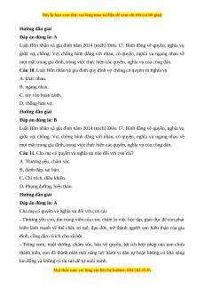 Câu 10. Luật Hôn nhân và gia đình quy định vợ chồng có quyền và nghĩa vụ A. khác nhau. B. ngang nhau. C. tùy vào hoàn cảnh. D. chồng hơn vợ. Hướng dẫn giải Đáp án đúng là: B