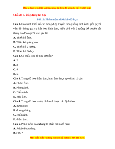 vấn đề thông qua sự k t ế h p ợ hình nh, ả ki u ể chữ v i ớ ý tư ng ở để truy n ề t i ả thông tin đ n ng ế ư i ờ xem g i ọ là? A. Thi t ế k ế nh. ả B. Thi t ế k qu ế ng ả cáo. C. Thi t ế k ý t ế ư ng. ở D. Thi t ế k đ ế ồ h a. ọ Câu 2. Có mấy lo i ạ đồ h a ọ c b ơ n? ả A. 2. B. 3. C. 4. D. 5. Câu 3. Trong đồ h a ọ đi m ể nh, hì ả nh nh đ ả ược t o t ạ hành t các: ừ A. Chấm nh. ả B. Khung nh. ả C. Đi m ể nh. ả D. Màu nh. ả Câu 4. Trong đồ h a ọ vect , hì ơ nh nh đ ả ược xác định theo: A. đư ng ờ nét. B. đư ng t ờ h ng. ẳ C. chấm nh. ả D. đi m ể nh. ả Câu 5. Ph n m ầ m