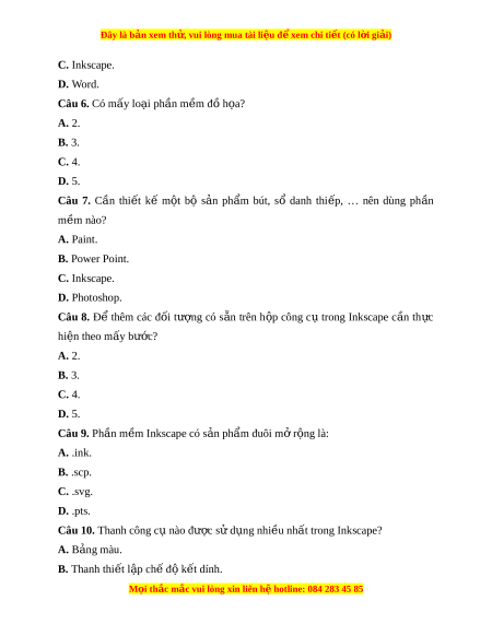 Đây là bản xem th , vu ử i lòng mua tài li u ệ đ xe ể m chi ti t (c ế ó l i ờ gi i ả ) C. Inkscape. D. Word. Câu 6. Có mấy lo i ạ ph n m ầ m ề đ h ồ a? ọ A. 2. B. 3. C. 4. D. 5. Câu 7. Cần thi t ế kế m t ộ bộ s n ả ph m ẩ bút, sổ danh thi p, ế … nên dùng ph n ầ m m ề nào? A. Paint. B. Power Point. C. Inkscape. D. Photoshop.