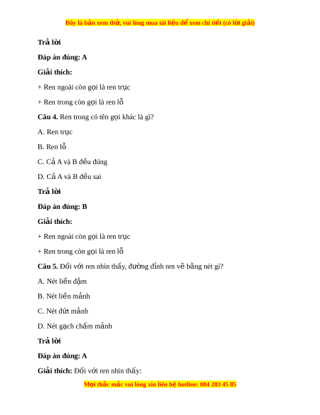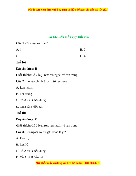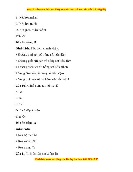 Đây là bản xem th , vu ử i lòng mua tài li u ệ đ xe ể m chi ti t (c ế ó l i ờ gi i ả ) Trả l i ờ Đáp án đúng: A Giải thích: + Ren ngoài còn g i ọ là ren tr c ụ + Ren trong còn g i ọ là ren lỗ