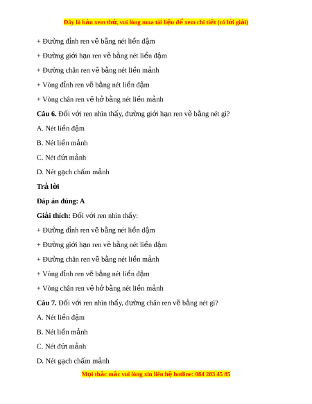 Đây là bản xem th , vu ử i lòng mua tài li u ệ đ xe ể m chi ti t (c ế ó l i ờ gi i ả ) Trả l i ờ Đáp án đúng: B Giải thích: Đ i ố v i ớ ren nhìn th y: ấ + Đư ng ờ đ nh r ỉ en v b ẽ ng ằ nét li n ề đ m ậ + Đư ng ờ gi i ớ h n r ạ en v b ẽ ng nét ằ li n đ ề m ậ + Đư ng ờ chân ren v b ẽ ng nét ằ li n m ề nh ả + Vòng đ nh r ỉ en v b ẽ ng ằ nét li n đ ề m ậ + Vòng chân ren v h ẽ b ở ng nét ằ li n ề m nh ả Câu 8. Đối v i ớ ren nhìn th y ấ ,vòng đ nh r ỉ en v b ẽ ng nét ằ gì? A. Nét li n ề đ m ậ B. Nét li n m ề nh ả C. Nét đ t ứ m nh ả D. Nét g ch ch ạ m ấ m nh ả Trả l i ờ Đáp án đúng: A Giải thích: Đ i ố v i ớ ren nhìn th y: ấ + Đư ng ờ đ nh r ỉ en v b ẽ ng ằ nét li n ề đ m ậ + Đư ng ờ gi i ớ h n r ạ en v b ẽ ng nét ằ li n đ ề m ậ + Đư ng ờ chân ren v b ẽ ng nét ằ li n m ề nh ả + Vòng đ nh r ỉ en v b ẽ ng ằ nét li n đ ề m ậ + Vòng chân ren v h ẽ b ở ng nét ằ li n ề m nh ả Câu 9. Đối v i ớ ren nhìn th y ấ , vòng chân ren v b ẽ ng ằ nét gì? A. Nét li n ề đ m ậ M i
