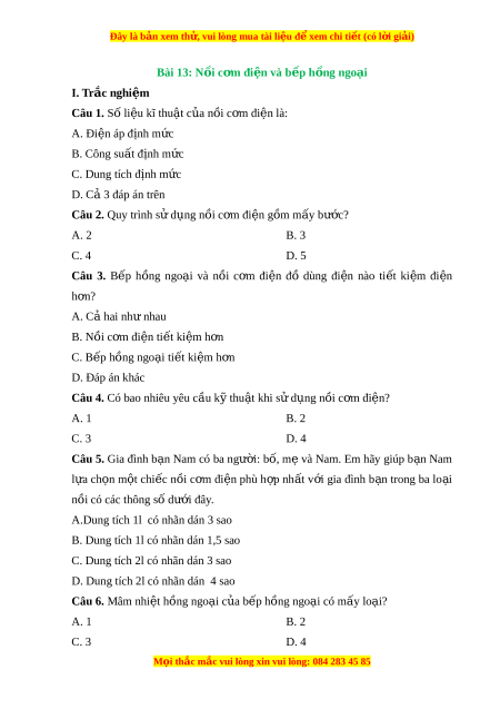 Đây là bản xem th , vu ử i lòng mua tài li u ệ đ xe ể m chi ti t ế (có l i ờ gi i ả ) Bài 13: N i ồ c m ơ đi n và b ệ p h ế ng ngo ồ i ạ I. Trắc nghi m ệ Câu 1. Số li u kĩ ệ thu t ậ c a ủ n i ồ c m ơ đi n l ệ à: A. Đi n áp đ ệ nh m ị c ứ B. Công su t ấ đ nh m ị c ứ C. Dung tích đ nh m ị c ứ D. Cả 3 đáp án trên