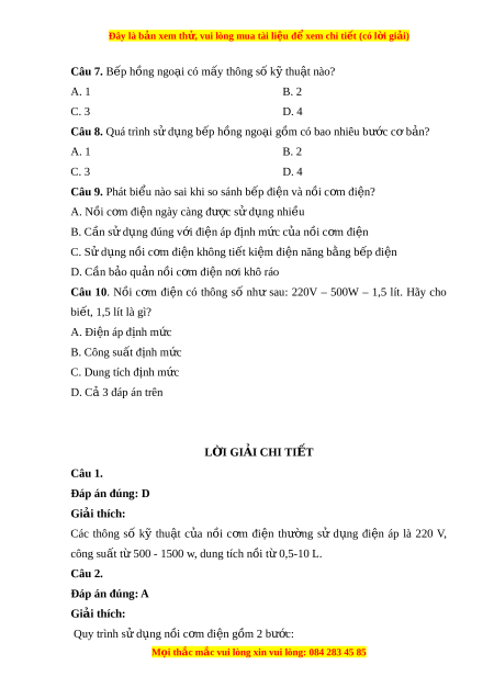 Đây là bản xem th , vu ử i lòng mua tài li u ệ đ xe ể m chi ti t ế (có l i ờ gi i ả ) Câu 6. Đáp án đúng: B Giải thích: Mâm nhi t ệ h ng ồ ngo i ạ có 2 lo i ạ , m t ộ là mâm nhi t ệ s ử d ng ụ dây mayso, hai là lo i ạ sử d ng bóng đèn hal ụ ogen nhi t ệ . Câu 7. Đáp án đúng: B Giải thích: B p h ế ồng ngo i ạ gồm 2 thông số k t ỹ hu t ậ là: - Điện áp định m c: ứ 220 V - Công suất đ nh m ị c 1000 w ứ , 1 500 w,... Câu 8. Đáp án đúng: C Giải thích: Nh ng b ữ ư c ớ c b ơ n ả khi s d ử ng ụ - Chu n ẩ b : ị Ki m ể tra và làm s ch ạ bề m t ặ b p; ế l a ự ch n ọ n i ồ , ch o ả n u ấ phù h p v ợ i ớ b p; ế đ t ặ nồi n u l ấ ên b p; ế c p đi ấ n cho b ệ p ế - B t ậ b p: ế Nh n ấ nút ngu n ồ (o), ch n ọ chế độ n u ấ ho c ặ đi u ề ch nh ỉ nhi t ệ độ phù h p. ợ - T t ắ b p: ế Sau khi n u xong, nh ấ n nút ấ ngu n đ ồ t ể t ắ b p ế Câu 9. Đáp án đúng: C Giải thích: Vì sử d ng ụ nồi c m ơ đi n t ệ i t ế ki m ệ đi n năng ệ h n ơ b p đi ế n. D ệ o nồi c m ơ đi n ệ lư ng ợ nhi t ệ sinh ra từ dây đ t ố nóng đư c ợ dùng m t ộ cách t i ố đa, vỏ n i ồ có 2 l p ớ ở gi a ữ 2 l p