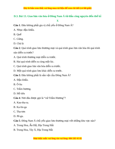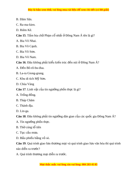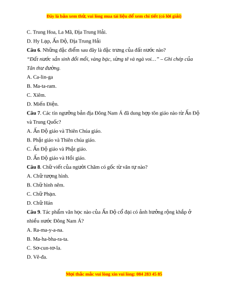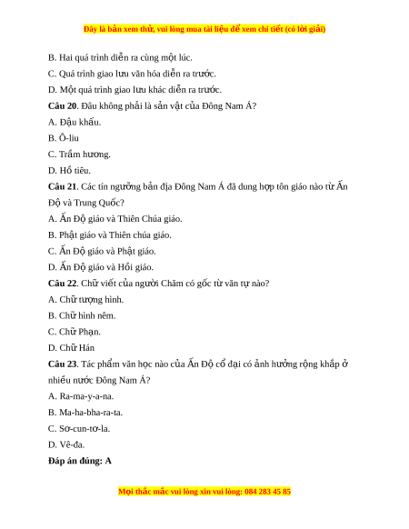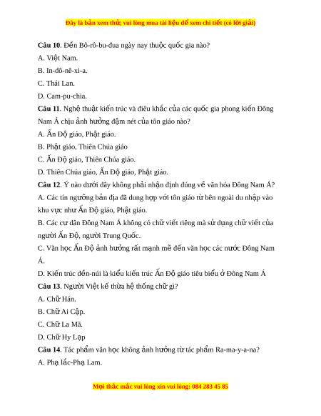 ề Bô-rô-bu-đua ngày nay thu c qu ộ c gi ố a nào? A. Việt Nam. B. In-đô-nê-xi-a. C. Thái Lan. D. Cam-pu-chia. Câu 11. Nghệ thu t ậ ki n t ế rúc và điêu kh c ắ c a các ủ qu c ố gia phong ki n Đ ế ông Nam Á ch u ị nh ả hư ng đ ở m ậ nét c a t ủ ôn giáo nào? A. n Đ Ấ ộ giáo, Ph t ậ giáo. B. Ph t ậ giáo, Thiên Chúa giáo C. n Đ Ấ gi ộ áo, Thiên Chúa giáo. D. Thiên Chúa giáo, n Đ Ấ gi ộ áo, Ph t ậ giáo. Câu 12. Ý nào dư i ớ đây không ph i ả nh n ậ đ nh đúng v ị văn hóa Đ ề ông Nam Á? A. Các tín ngư ng b ỡ n ả đ a đã dung h ị p v ợ i ớ tôn giáo t bên ừ ngoài du nh p vào ậ khu v c ự nh ư n Đ Ấ gi ộ áo, Ph t ậ giáo. B. Các c dân Đ ư ông Nam Á không có ch vi ữ t ế riêng mà s d ử ng ch ụ ữ vi t ế c a ủ ngư i ờ n Đ Ấ , ng ộ ư i ờ Trung Qu c. ố C. Văn h c ọ n Đ Ấ ộ nh ả hư ng r ở t ấ m nh m ạ đ ẽ n văn h ế c các ọ nư c ớ Đông Nam Á. D. Ki n t ế rúc đ n- ề núi là ki u ki ể n t ế rúc n Đ Ấ gi ộ áo tiêu bi u ể Đ ở ông Nam Á Câu 13. Ngư i ờ Vi t ệ k t ế h a h ừ t ệ h ng ch ố ữ gì? A. Chữ Hán. B. Ch ữ Ai C p. ậ C. Ch L ữ a Mã. D. Chữ Hy L p ạ