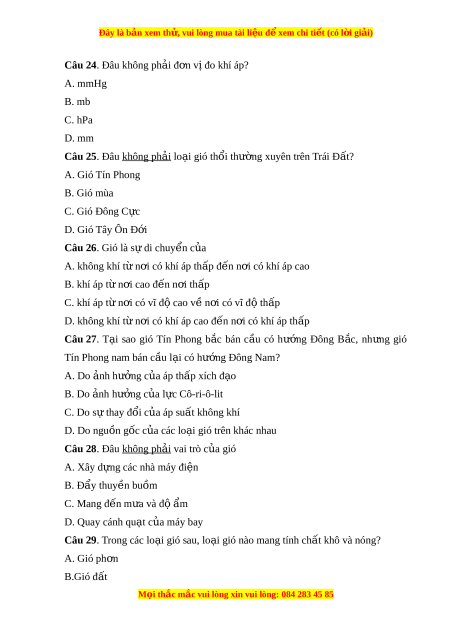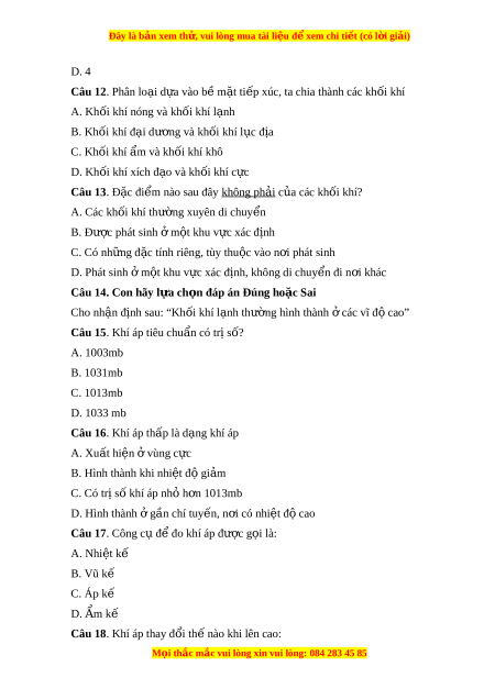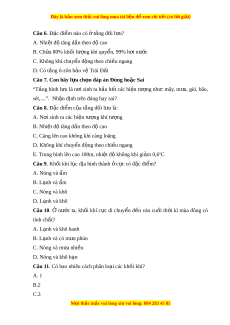 Đây là bản xem th , vu ử i lòng mua tài li u ệ đ xe ể m chi ti t ế (có l i ờ gi i ả ) D. 4 Câu 12. Phân lo i ạ d a vào ự b m ề t ặ ti p xúc, t ế a chia thành các kh i ố khí A. Kh i ố khí nóng và kh i ố khí l nh ạ B. Khối khí đ i ạ dư ng ơ và kh i ố khí l c ụ đ a ị C. Khối khí m ẩ và kh i ố khí khô D. Kh i ố khí xích đ o ạ và kh i ố khí c c ự Câu 13. Đ c ặ đi m ể nào sau đây không ph i ả c a ủ các khối khí?