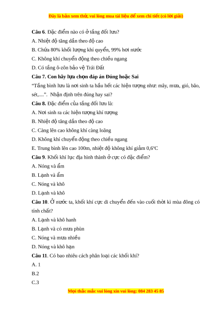 Đây là bản xem th , vu ử i lòng mua tài li u ệ đ xe ể m chi ti t ế (có l i ờ gi i ả ) Câu 6. Đ c ặ đi m ể nào có t ở ng đ ầ ối l u? ư A. Nhiệt đ t ộ ăng dần theo đ cao ộ B. Chứa 80% khối lư ng ợ khí quy n, ể 99% h i ơ nư c ớ C. Không khí chuy n ể đ ng t ộ heo chi u ngang ề D. Có tầng ô-zôn b o v ả ệ Trái Đ t ấ Câu 7. Con hãy l a ch ự n đáp án Đ ọ úng ho c Sai ặ “Tầng bình l u ư là n i ơ sinh ta h u ầ h t ế các hi n ệ tư ng ợ nh : ư mây, m a, ư gió, bão, sét,....”. Nh n đ ậ ịnh trên đúng hay sai? Câu 8. Đ c ặ đi m ể c a t ủ ầng đối l u l ư à: A. N i ơ sinh ra các hi n t ệ ư ng khí ợ tư ng ợ B. Nhi t ệ đ t ộ ăng d n t ầ heo đ cao ộ