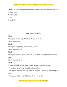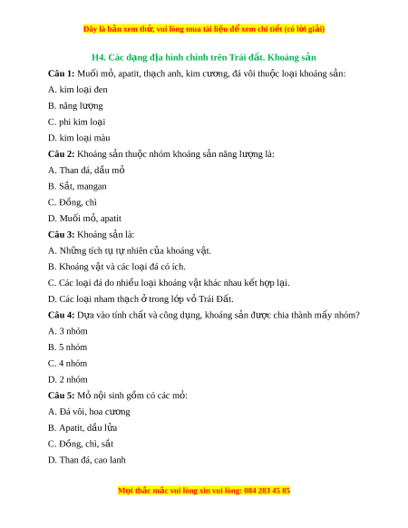 nh chính trên Trái đ t ấ . Khoáng s n ả Câu 1: Muối m , apat ỏ it, th ch ạ anh, kim cư ng, đá vôi ơ thu c ộ lo i ạ khoáng s n: ả A. kim lo i ạ đen B. năng lư ng ợ C. phi kim lo i ạ D. kim lo i ạ màu Câu 2: Khoáng s n t ả hu c nhóm ộ khoáng s n năng ả lư ng l ợ à: A. Than đá, d u m ầ ỏ B. S t ắ , mangan C. Đồng, chì D. Muối m , ỏ apatit Câu 3: Khoáng s n l ả à: A. Nh ng ữ tích t t ụ nhi ự ên c a khoáng v ủ t ậ . B. Khoáng v t ậ và các lo i ạ đá có ích. C. Các lo i ạ đá do nhi u l ề o i ạ khoáng v t ậ khác nhau k t ế h p l ợ i ạ . D. Các lo i ạ nham thạch t ở rong l p v ớ ỏ Trái Đ t ấ . Câu 4: D a vào t ự ính ch t ấ và công d ng, ụ khoáng s n ả đư c chi ợ a thành m y nhóm ấ ? A. 3 nhóm B. 5 nhóm C. 4 nhóm D. 2 nhóm Câu 5: Mỏ n i ộ sinh gồm có các m : ỏ A. Đá vôi, hoa cư ng ơ B. Apatit, d u l ầ a ử C. Đồng, chì, s t ắ D. Than đá, cao lanh M i ọ thắc m c