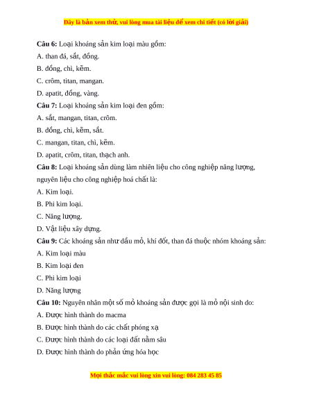Đây là bản xem th , vu ử i lòng mua tài li u ệ đ xe ể m chi ti t (c ế ó l i ờ gi i ả ) Câu 6: Lo i ạ khoáng s n ả kim lo i ạ màu g m ồ : A. than đá, s t ắ , đồng. B. đồng, chì, k m ẽ . C. crôm, titan, mangan. D. apatit, đồng, vàng. Câu 7: Lo i ạ khoáng s n ả kim lo i ạ đen g m ồ : A. s t ắ , mangan, titan, crôm. B. đồng, chì, k m ẽ , s t ắ . C. mangan, titan, chì, k m ẽ . D. apatit, crôm, titan, th ch ạ anh. Câu 8: Lo i ạ khoáng s n