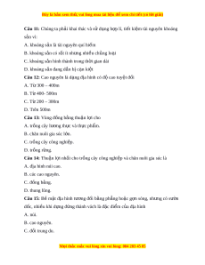 C. trồng cây công nghiệp. D. trồng r ng. ừ Câu 14: Thu n ậ l i ợ nh t ấ cho tr ng cây công nghi ồ p và chăn ệ nuôi gia súc là A. địa hình núi cao. B. các cao nguyên. C. đồng b ng. ằ D. thung lũng. Câu 15: B m ề t ặ địa hình tư ng đ ơ i ố b ng ằ ph ng ho ẳ c g ặ n s ợ óng, nh ng có s ư ư n ờ dốc, nhi u khi ề d ng đ ự ng t ứ hành vách là đ c ặ đi m ể c a đ ủ a hì ị nh A. núi. B. cao nguyên. C. đồi trung du. M i ọ thắc m c