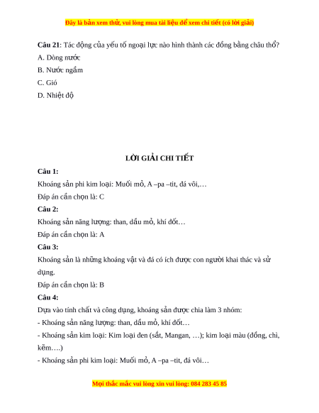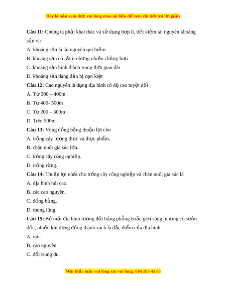 Đây là bản xem th , vu ử i lòng mua tài li u ệ đ xe ể m chi ti t (c ế ó l i ờ gi i ả ) Câu 11: Chúng ta ph i ả khai thác và s d ử ng ụ h p l ợ í, ti t ế ki m ệ tài nguyên khoáng s n vì ả : A. khoáng s n l ả à tài nguyên quí hi m ế B. khoáng s n ả có r t ấ ít nh ng nhi ư u ch ề ng ủ lo i ạ C. khoáng s n ả hình thành trong th i ờ gian dài D. khoáng s n đang ả dần bị c n ạ ki t ệ