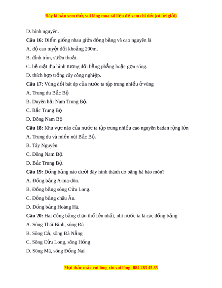 Đây là bản xem th , vu ử i lòng mua tài li u ệ đ xe ể m chi ti t (c ế ó l i ờ gi i ả ) D. bình nguyên. Câu 16: Đi m ể giống nhau gi a đ ữ ng b ồ ng và cao ằ nguyên là