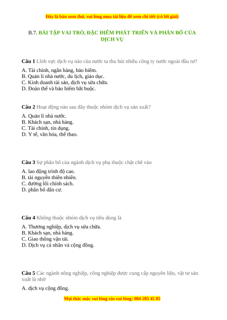 B.7. BÀI TẬP VAI TRÒ, ĐẶC ĐIỂM PHÁT TRIỂN VÀ PHÂN BỐ CỦA DỊCH VỤ