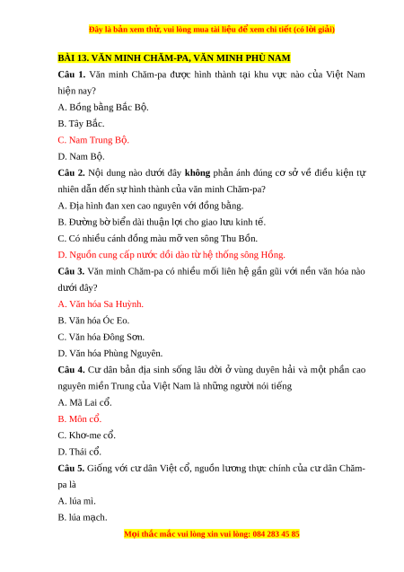 Câu 3. Văn minh Chăm-pa có nhi u ề m i ố liên h ệ g n ầ gũi v i ớ n n ề văn hóa nào dư i ớ đây? A. Văn hóa Sa Huỳnh. B. Văn hóa Óc Eo. C. Văn hóa Đông S n. ơ D. Văn hóa Phùng Nguyên. Câu 4. Cư dân b n ả đ a ị sinh s ng ố lâu đ i ờ ở vùng duyên h i ả và m t ộ ph n ầ cao nguyên mi n ề Trung c a ủ Việt Nam là nh ng ng ữ ư i ờ nói ti ng ế A. Mã Lai cổ. B. Môn cổ. C. Kh - ơ me cổ. D. Thái cổ. Câu 5. Giống v i ớ cư dân Vi t ệ c , ổ ngu n ồ lư ng ơ th c ự chính c a ủ c ư dân Chăm- pa là A. lúa mì. B. lúa m ch. ạ M i